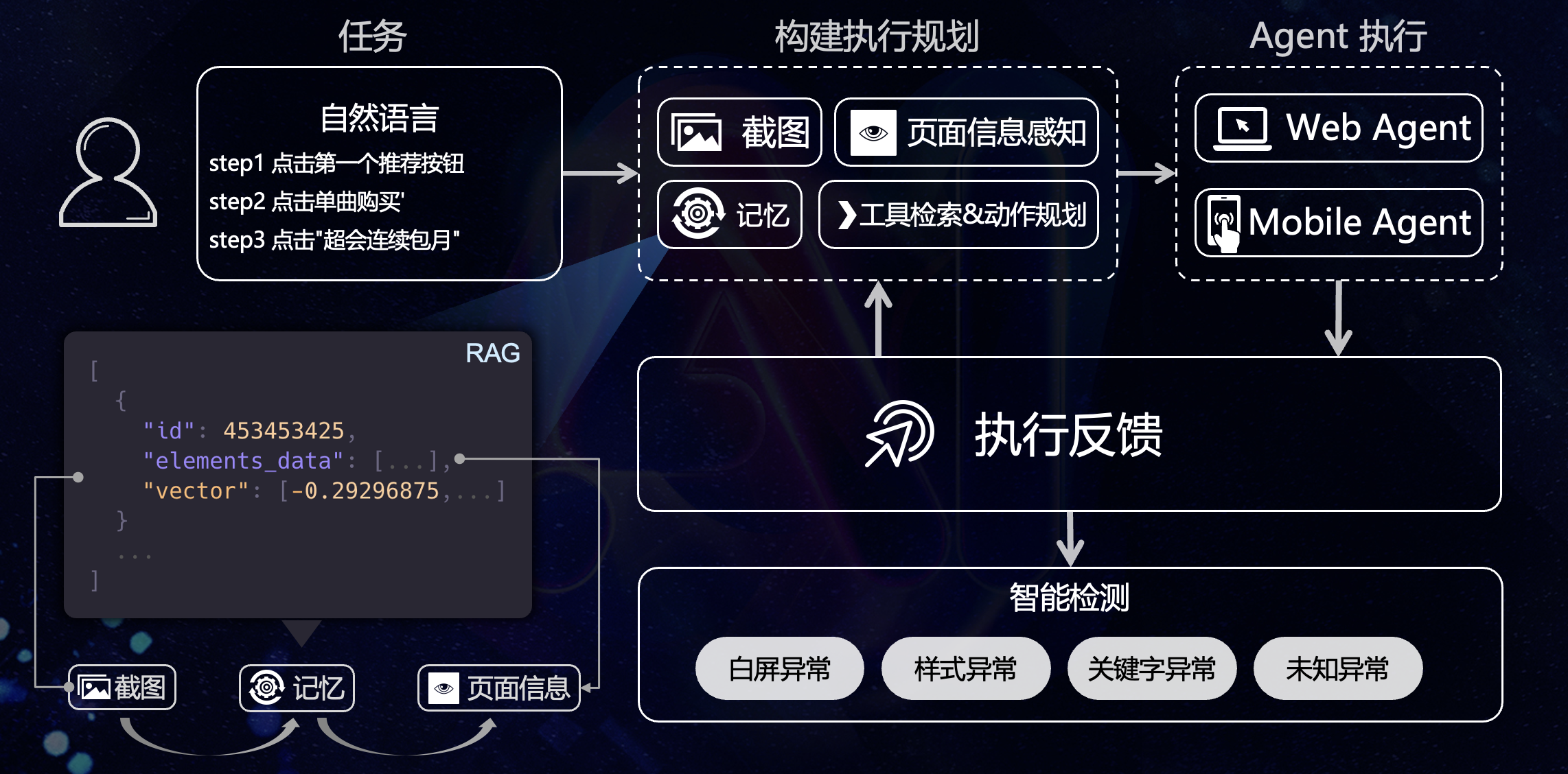PageEyes Agent 以自然语言指令颠覆传统UI自动化:无需编写脚本,也能实现复杂的跨平台测试与巡检。 基于 Pydantic AI 框架开发, 其中元素信息感知能力依靠 OmniParserV2 模型,不依赖视觉语言大模型, 即使小参数的 LLM 也能胜任路径规划能力,同时支持多平台(Web、Android)