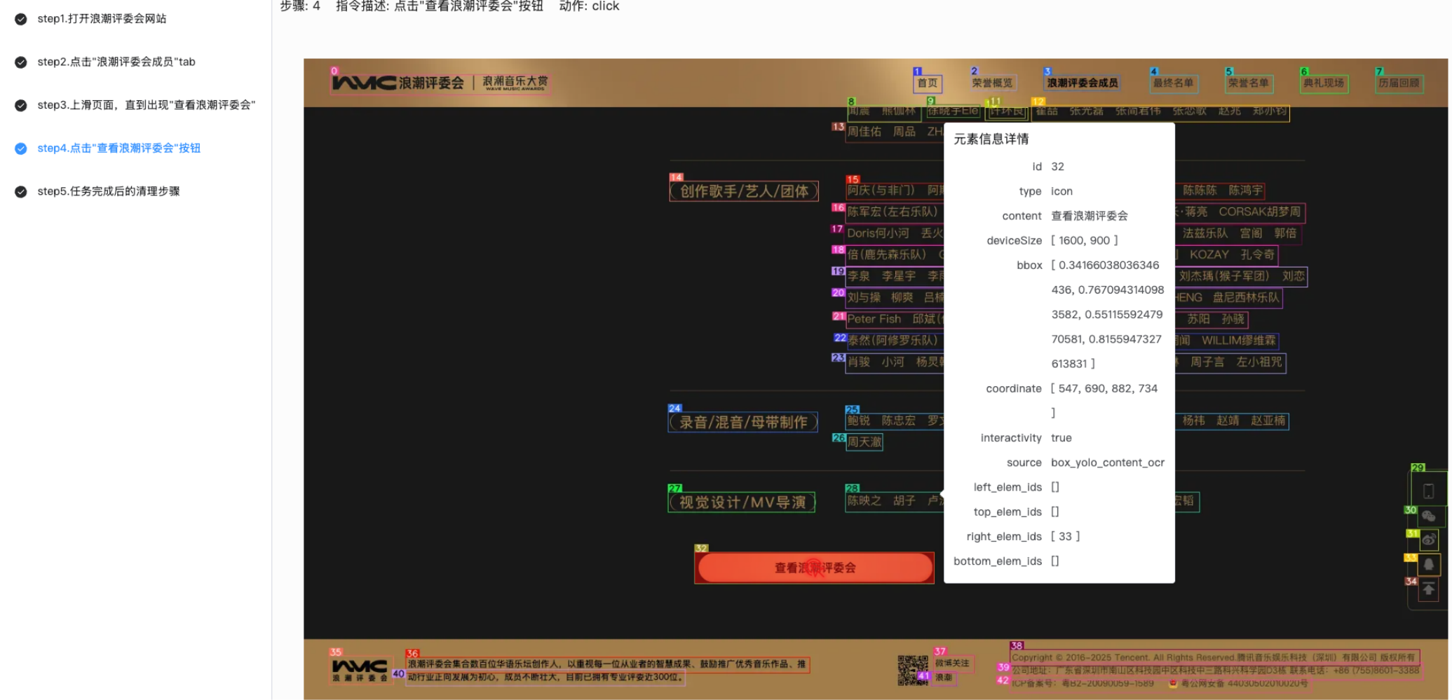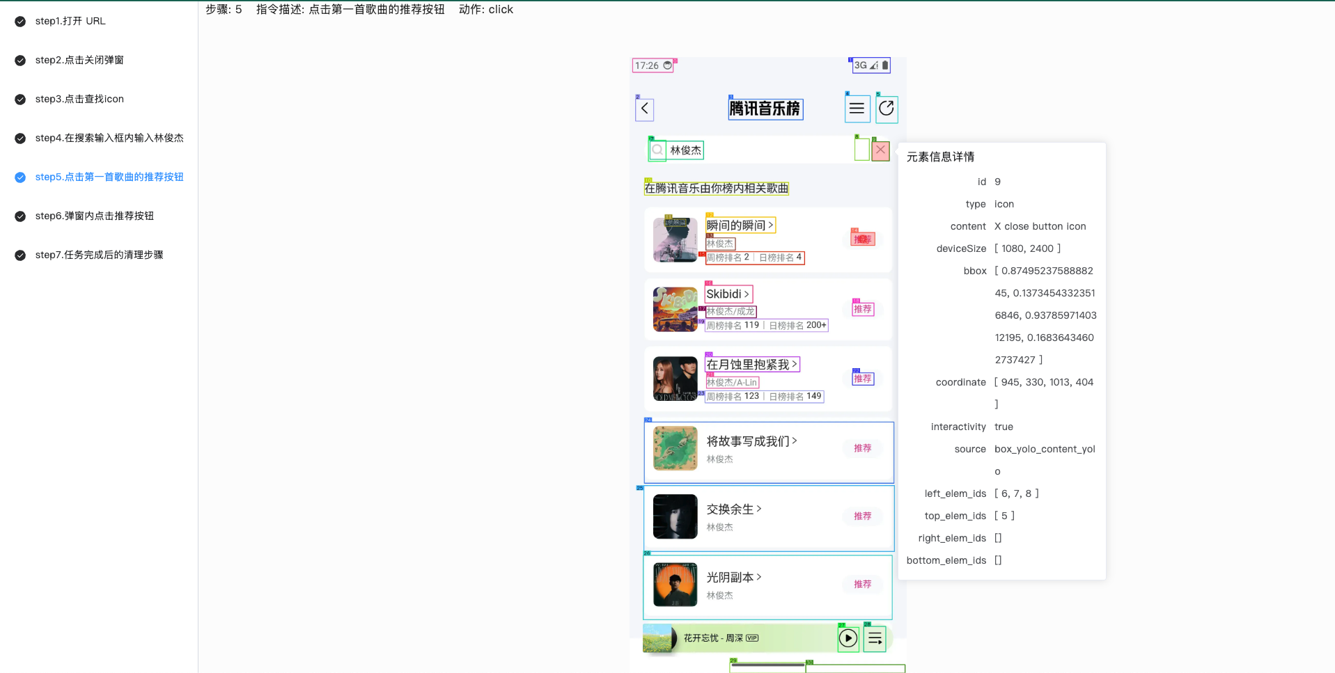 报告内容为每个步骤对应页面的元素信息详情(包括元素位置、大小、识别内容、周围元素等),方便调试与回顾。